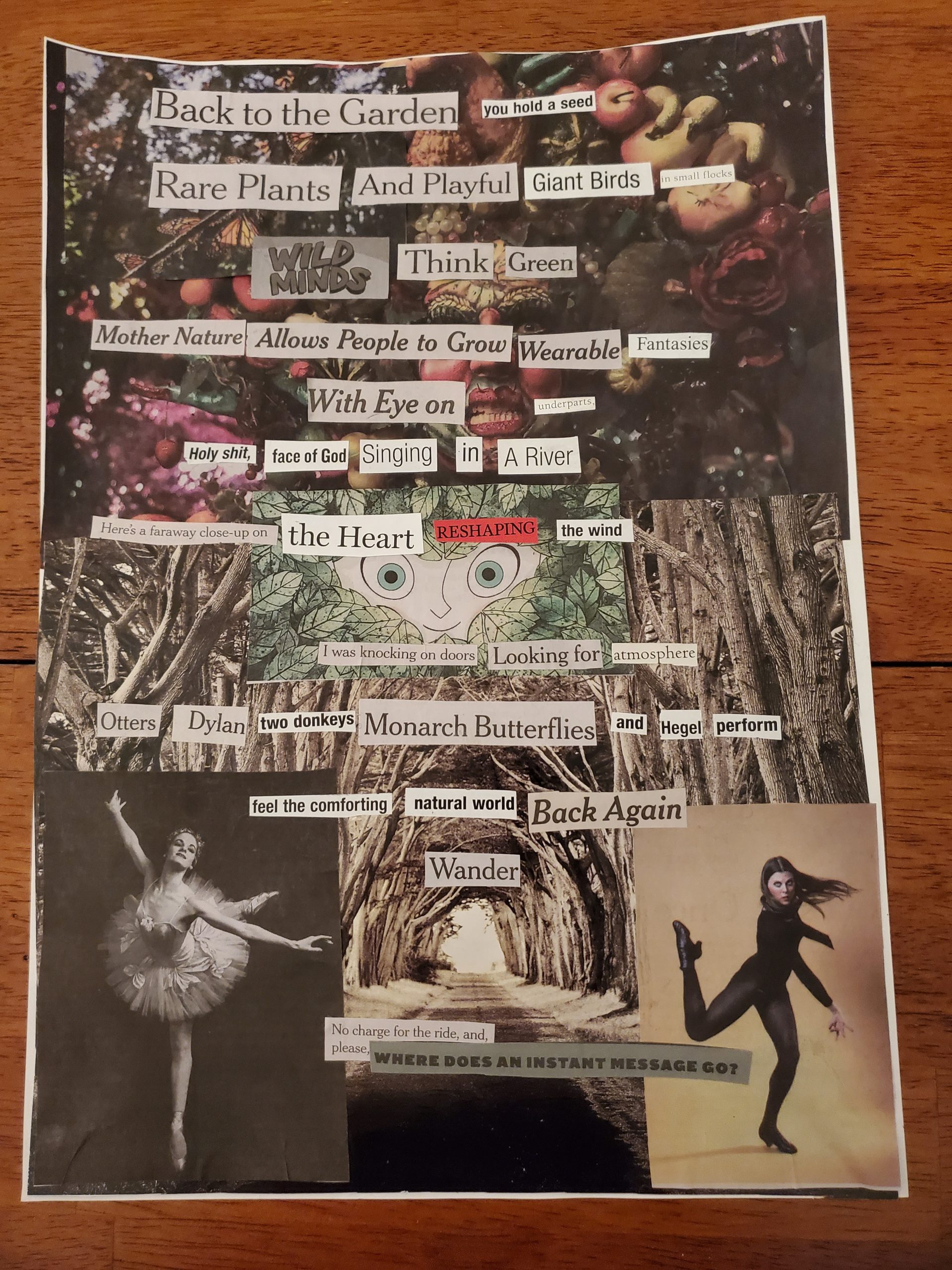 Amy: Paperjam is a pun I made up to describe the poem collages I make from newspaper headlines and images. I started making these during the Covid period, as I felt the world had gone mad and I couldn’t believe what I was reading in the papers. So I made my own news, scrambling the words that felt strangely alienating into new patterns of meaning. I’m attaching one related to nature to give you an idea.