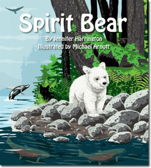 Harrington’s book Spirit Bear is a wonderful fictional trek into the Great Bear Rainforest and is published by Eco Books 4 Kids. Eco Books 4 Kids writes and illustrates books that introduce children to interesting stories based upon our natural environment. The publisher also offers teacher’s instructional resources. Their newest book, Spirit Bear, celebrates a rare and iconic black bear that is born with a recessive gene that makes its coat creamy or white. Also called the Kermode bear, the spirit bear lives in the delicate, rich, and threatened ecosystem of the Great Bear Rainforest in British Columbia, Canada. The book is written by Jennifer Harrington and illustrated by Michael Arnott, and tells the story of a young spirit bear named Annuk, who falls into a river and is swept away from his mother. His journey home is a harrowing experience, complete with predators and trials, but also new friends and new understanding about the world he inhabits—the Great Bear Rainforest. I interviewed Jennifer on her experiences with educating children about our crucial environmental habitats and on creating such a fascinating and important story.