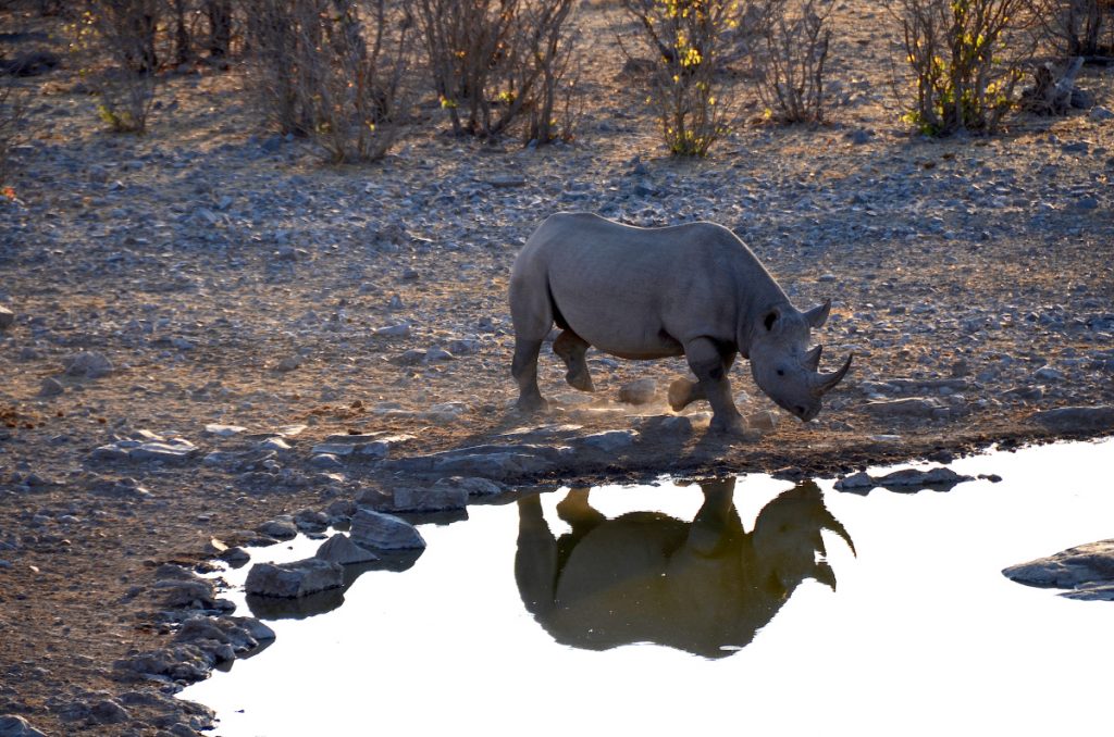 The featured image is of a black rhinoceros at Halali waterhole, by Olga Ernst.
